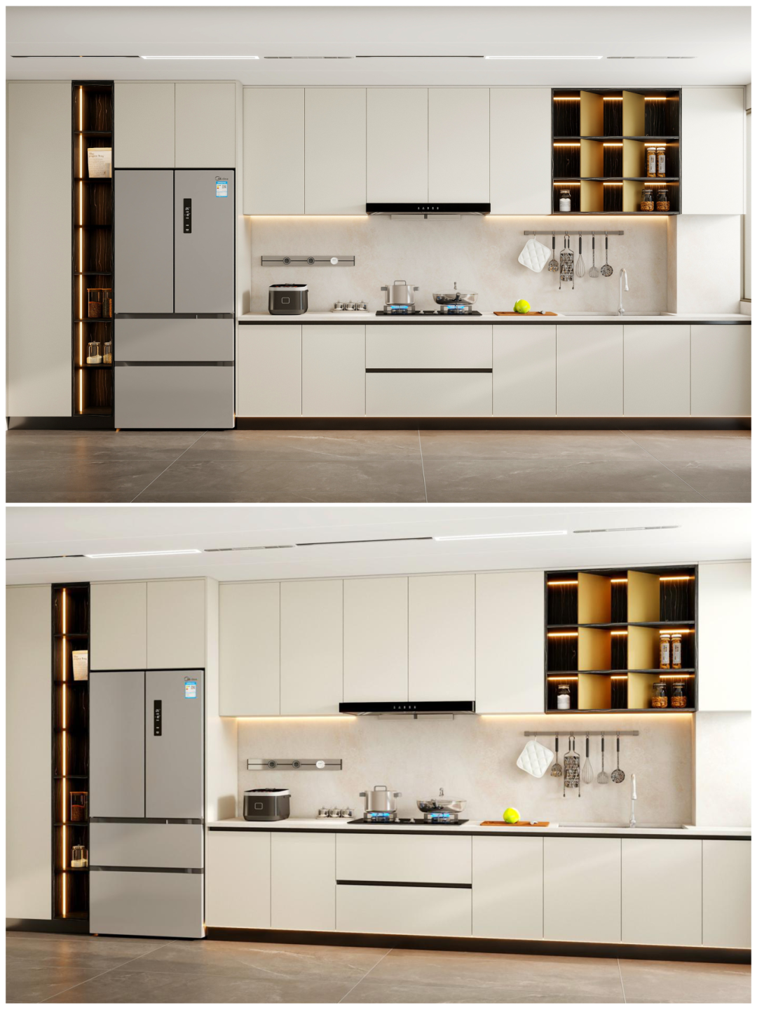 空間利用(yong)率高(gao),轉角設(shè)計(ji)形成(cheng)洗切炒黃金三角動(dòng)線(xiàn)📐可(kě)利用(yong)轉角櫃安(an)裝(zhuang)旋轉拉籃或飛碟拉籃,提升收納能(néng)力(li)