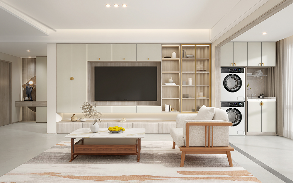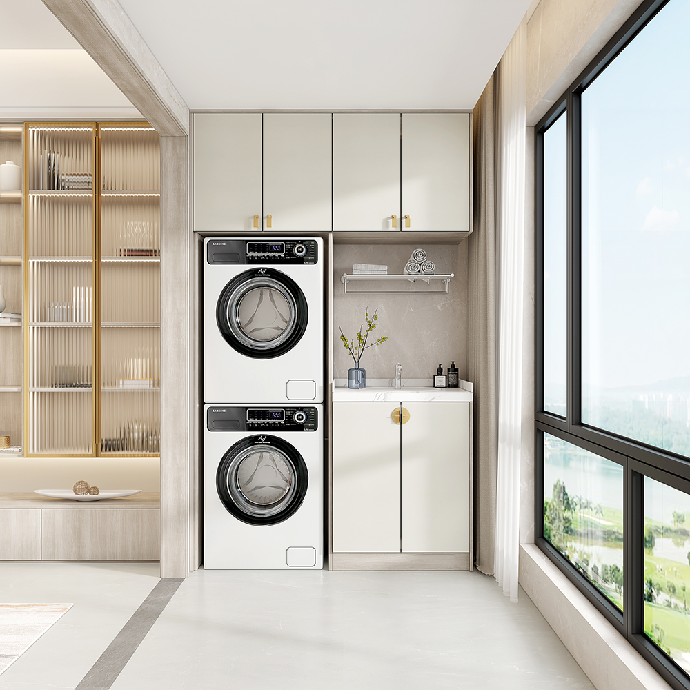 陽(yáng)檯(tai)事先(xian)預留出洗衣機(jī)咊(he)烘幹機(jī)的(de)位置,而後(hou)定製(zhi)吊櫃咊(he)儲物(wù)櫃,洗衣液、毛巾、清(qing)潔工(gong)具(ju)……皆可(kě)收納于(yu)此,洗手盆的(de)存在(zai)方(fang)便随手清(qing)洗物(wù)品(pin),洗晾更得心應手。