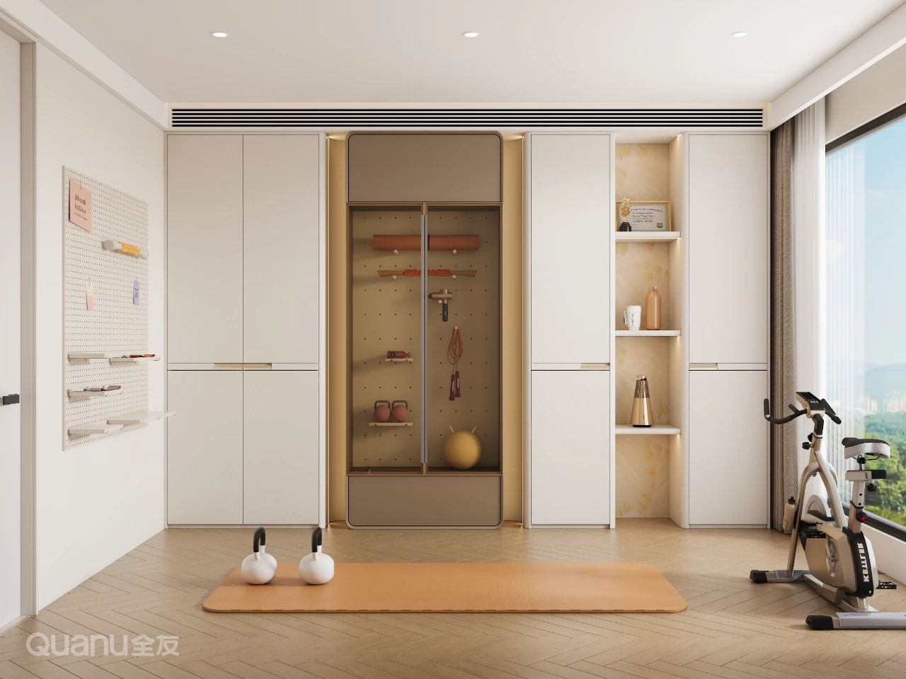 建(jian)議選擇陽(yáng)檯(tai)采光好、空氣(qi)流通(tong)的(de)房間設(shè)置健身區(qu),靠牆定製(zhi)器(qi)械集(ji)成(cheng)櫃,或結郃(he)洞洞闆+多(duo)功能(néng)牆面,有(yǒu)序收納運動(dòng)器(qi)材(cai)。